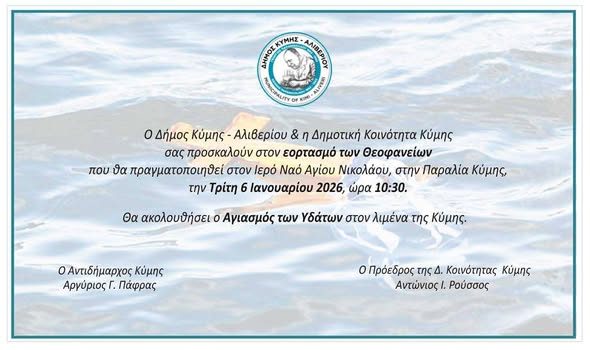 Ο Δήμος Κύμης – Αλιβερίου και η Δημοτική Κοινότητα Κύμης προσκαλούν τους πολίτες στον εορτασμό των Αγίων Θεοφανείων, που θα πραγματοποιηθεί την Τρίτη 6 Ιανουαρίου 2026 και ώρα 10:30 π.μ., στον Ιερό Ναό Αγίου Νικολάου, στην Παραλία Κύμης.