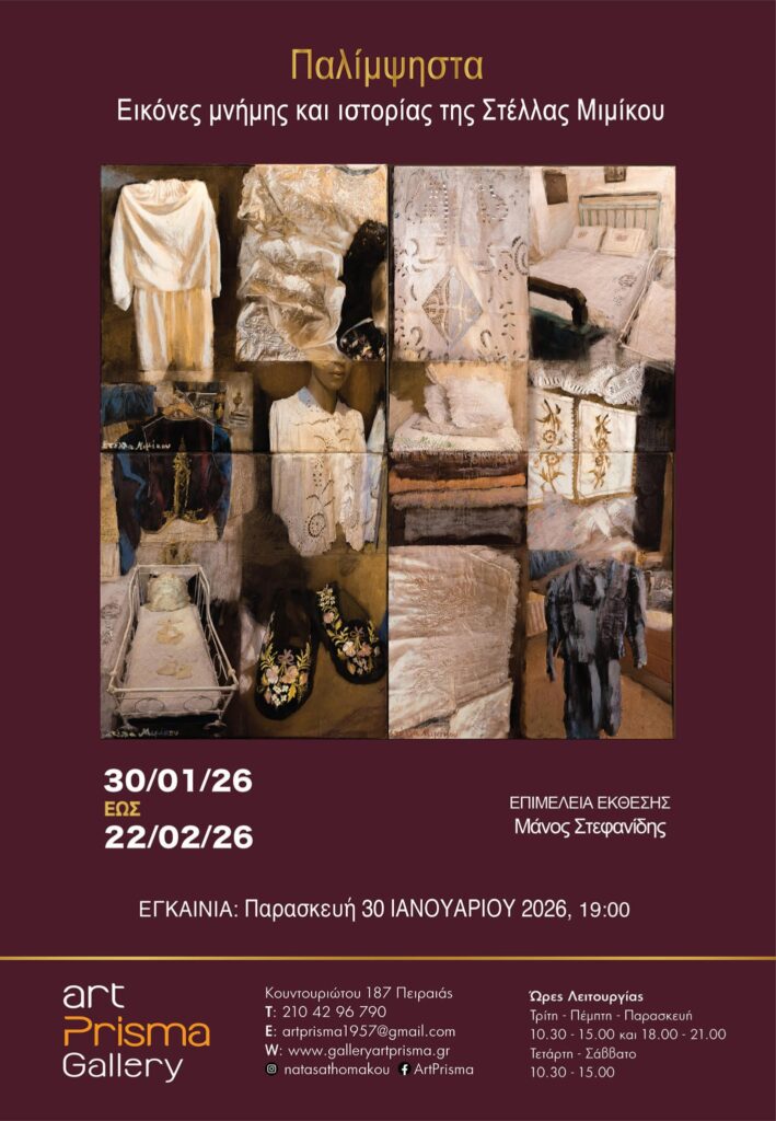 Την ατομική της έκθεση με τίτλο «ΠΑΛΙΜΨΗΣΤΑ – Εικόνες μνήμης και ιστορίας» παρουσιάζει η διεθνώς καταξιωμένη εικαστικός και ακτιβίστρια Στέλλα Μιμίκου στην Gallery Art Prisma στον Πειραιά. Τα εγκαίνια της έκθεσης θα πραγματοποιηθούν την Παρασκευή 30 Ιανουαρίου 2026, στις 19:00, ενώ η έκθεση θα διαρκέσει έως και τις 22 Φεβρουαρίου 2026.
