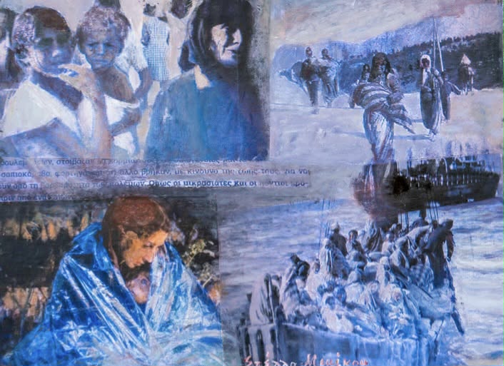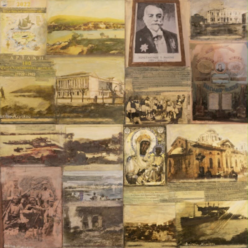 Η Στέλλα Μιμίκου, με πολυετή διεθνή παρουσία και συμμετοχές σε σημαντικές Μπιενάλε και φεστιβάλ τέχνης σε Ευρώπη, Ασία και Αμερική, παρουσιάζει σαράντα έργα μικτής τεχνικής, τοποθετημένα σε συνεχή διάταξη που θυμίζει σύγχρονη ζωφόρο. Μέσα από επάλληλες στρώσεις εικόνων, φωτογραφιών και ζωγραφικών παρεμβάσεων, τα έργα συνθέτουν έναν εικαστικό διάλογο ανάμεσα στην προσωπική μνήμη, τη συλλογική ιστορία και τον μύθο.