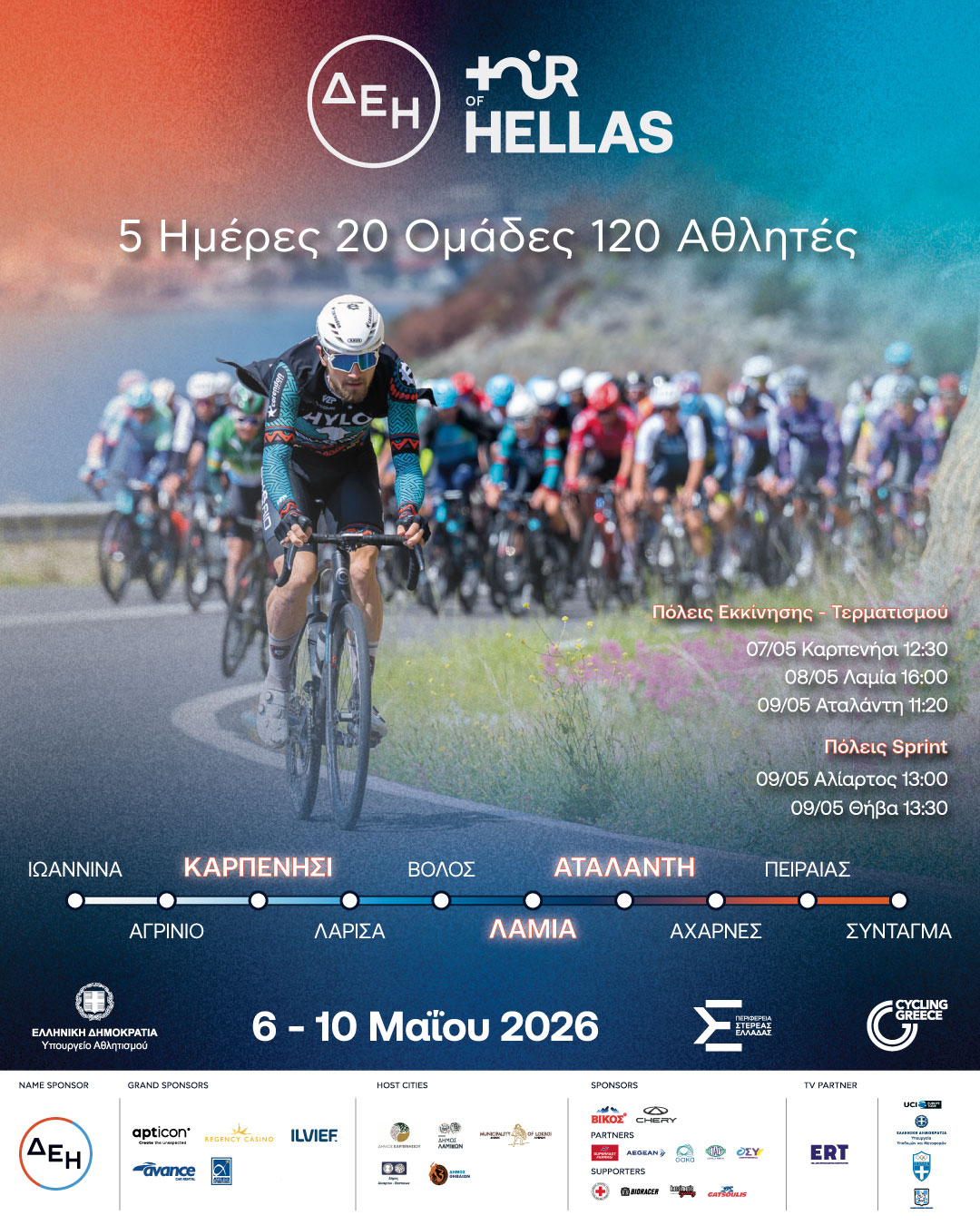 Συνέντευξη Τύπου για το ΔΕΗ Tour of Hellas 2026 θα πραγματοποιηθεί τη Δευτέρα 20 Απριλίου στη Λαμία, με τη συμμετοχή εκπροσώπων της κυβέρνησης, της τοπικής αυτοδιοίκησης και της οργανωτικής επιτροπής του αγώνα.