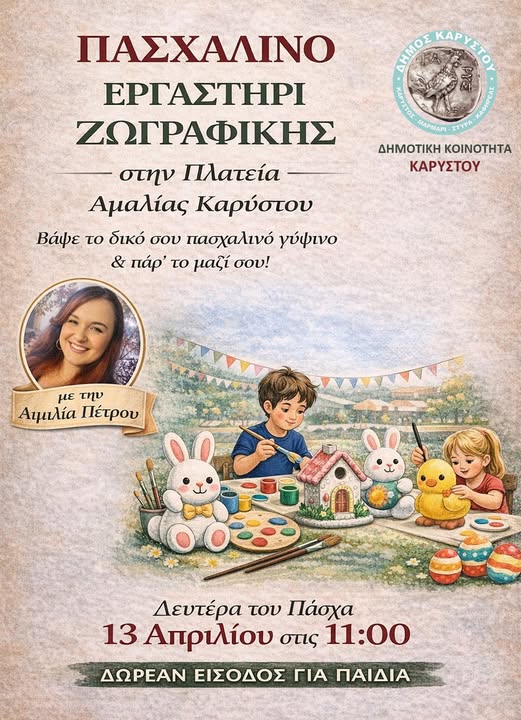 Μια όμορφη πασχαλινή δράση αφιερωμένη στα παιδιά διοργανώνει η Δημοτική Κοινότητα Καρύστου, προσκαλώντας μικρούς και μεγάλους σε μια γιορτή δημιουργίας και χαράς.