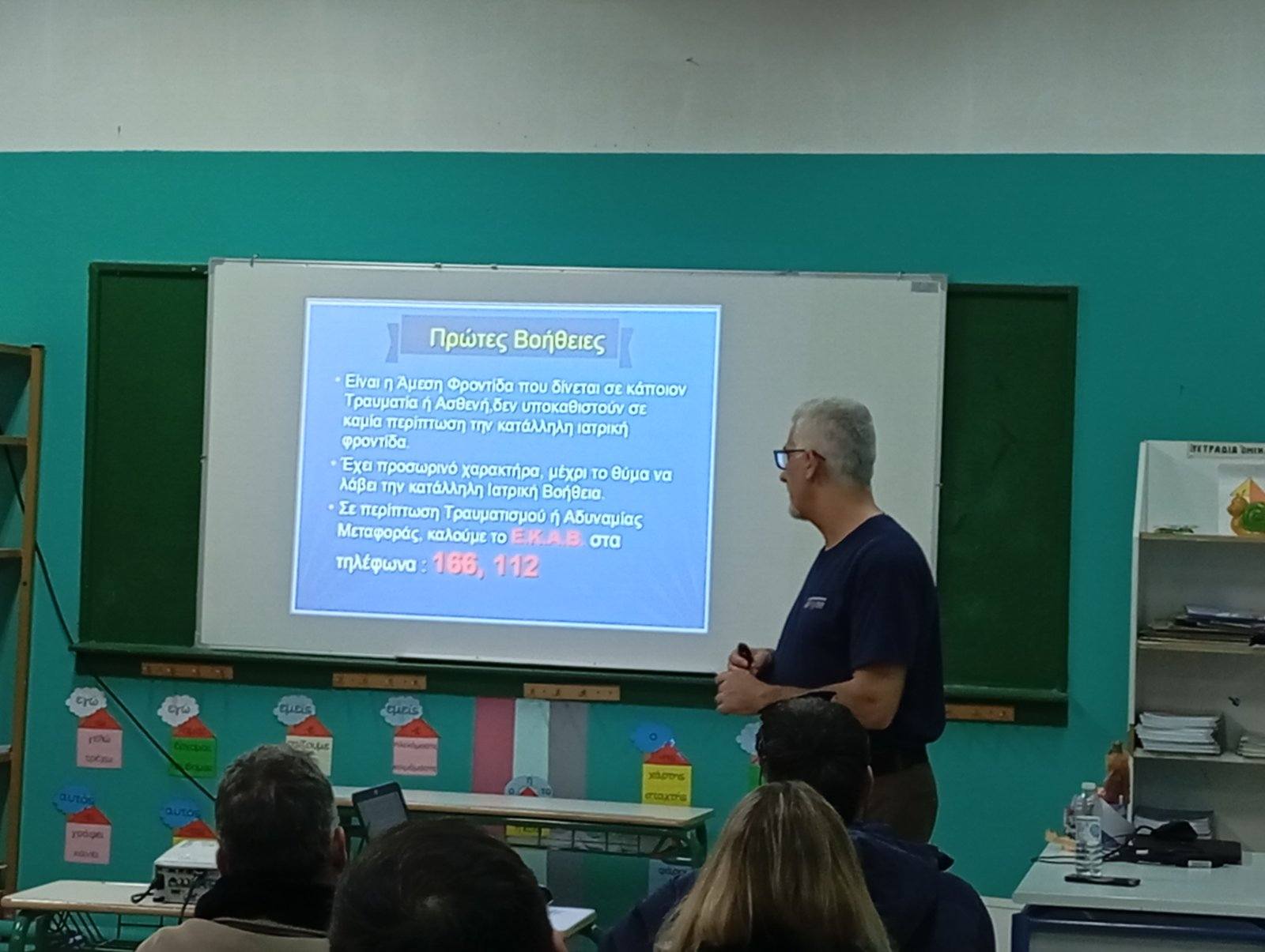 Οι συμμετέχοντες είχαν την ευκαιρία να ενημερωθούν για βασικές δεξιότητες Πρώτων Βοηθειών και για τη σωστή αντιμετώπιση έκτακτων περιστατικών μέχρι την άφιξη εξειδικευμένης βοήθειας. Κατά τη διάρκεια της δράσης παρουσιάστηκαν πρακτικές οδηγίες και κατευθυντήριες γραμμές για την ψύχραιμη και αποτελεσματική διαχείριση περιστατικών που μπορεί να συμβούν στο σχολικό ή οικογενειακό περιβάλλον, ενισχύοντας το αίσθημα ασφάλειας και ετοιμότητας όλων.
