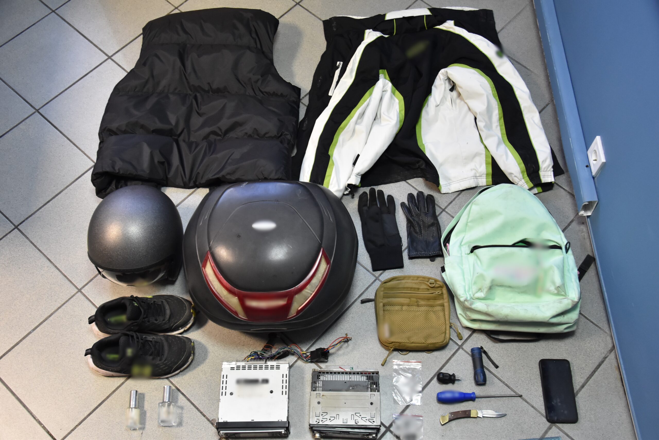 Η λεία που αποκόμισε περιλαμβάνει χρηματικά ποσά, ηχοσυστήματα αυτοκινήτων, κινητά τηλέφωνα, φορητό υπολογιστή, μπαταρίες και φορτιστές, καθώς και προσωπικά αντικείμενα των θυμάτων, με τη συνολική αξία να ξεπερνά τα 4.500 ευρώ.