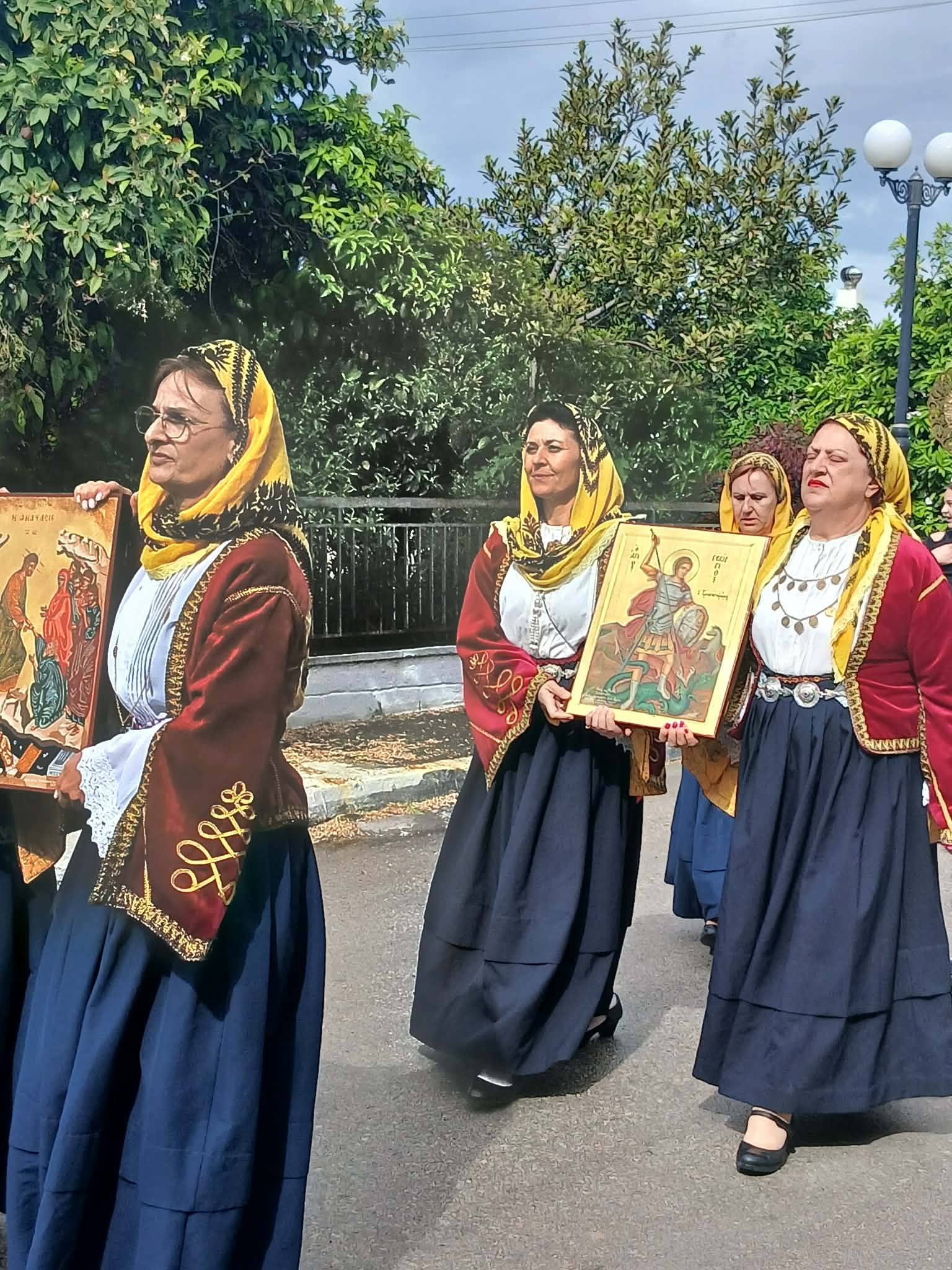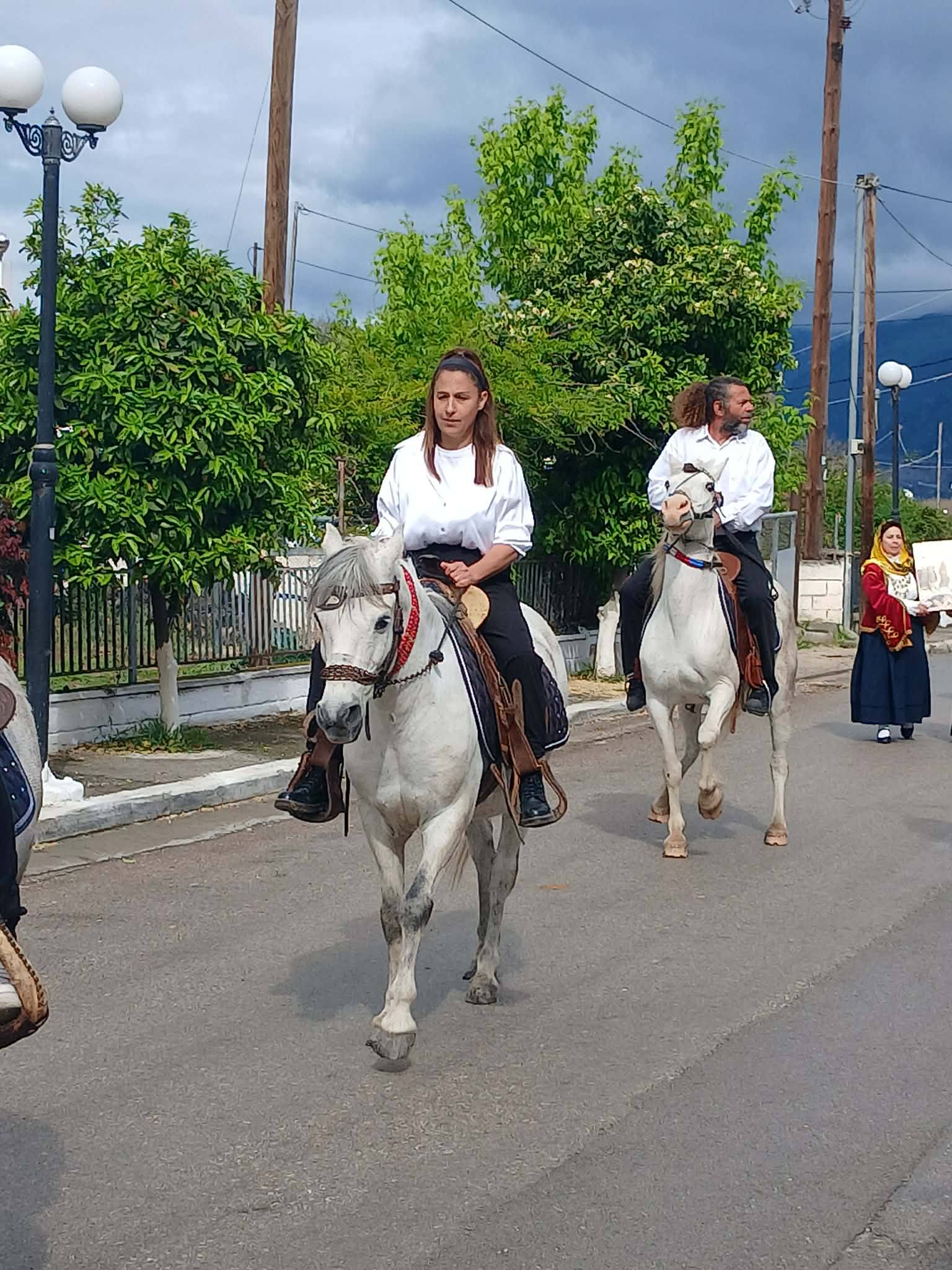 Στους δρόμους του χωριού ξεδιπλώθηκε μια κατανυκτική πομπή, όπου η εικόνα του Αγίου μεταφέρθηκε με σεβασμό και ευλάβεια, πλαισιωμένη από έφιππους συμμετέχοντες και πιστούς που κρατούσαν εικόνες στα χέρια τους. Το θέαμα των αλόγων να συνοδεύουν τη λιτανεία δημιούργησε μια ατμόσφαιρα που παρέπεμπε σε άλλες εποχές, αναδεικνύοντας τον διαχρονικό συμβολισμό του Αγίου ως προστάτη και καβαλάρη.