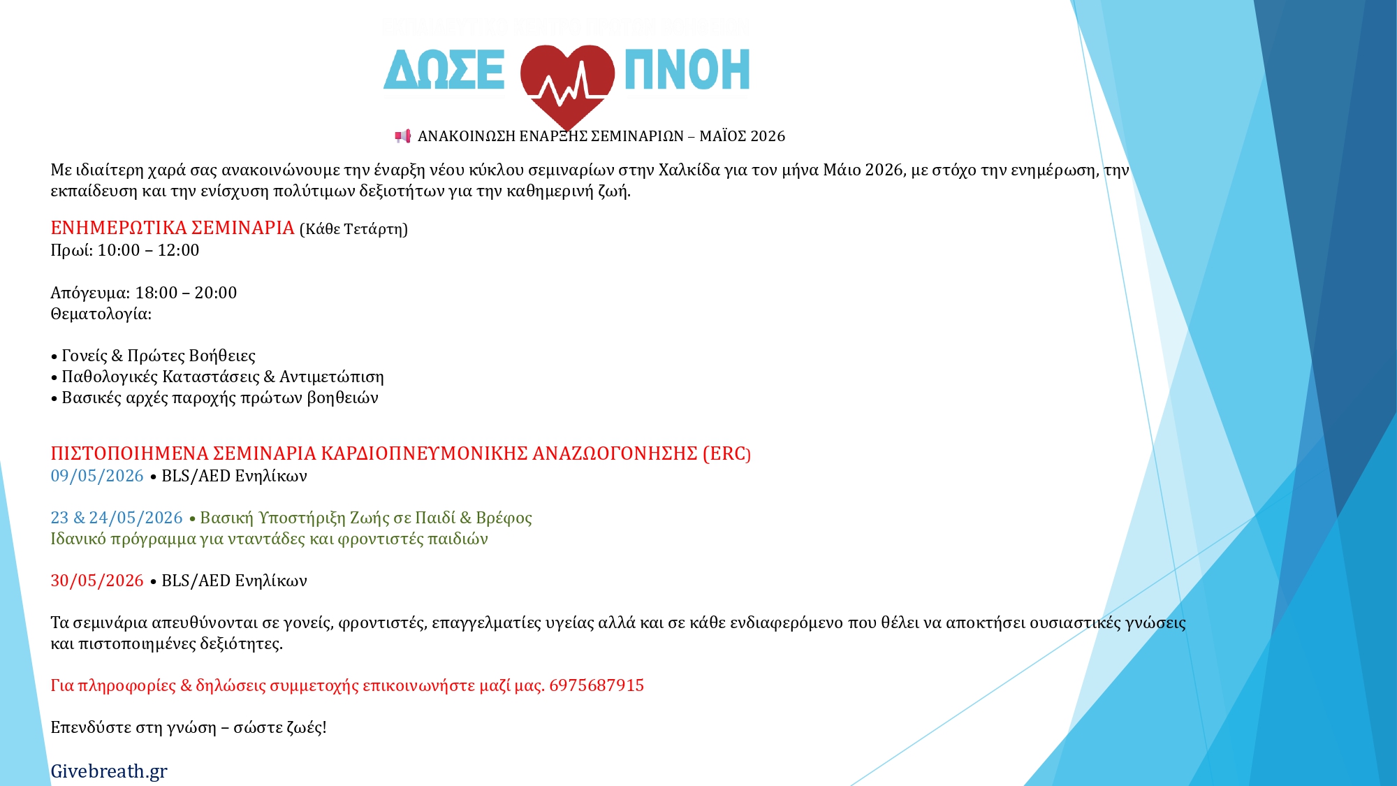 Νέος κύκλος εκπαιδευτικών σεμιναρίων με στόχο την ενημέρωση και την απόκτηση πολύτιμων δεξιοτήτων πρώτων βοηθειών ξεκινά στη Χαλκίδα τον Μάιο του 2026, με πρωτοβουλία της ομάδας «Δώσε Πνοή» και υπεύθυνο τον ειδικό εκπαιδευτή – διασώστη Σταύρο Τζιγιάννη.