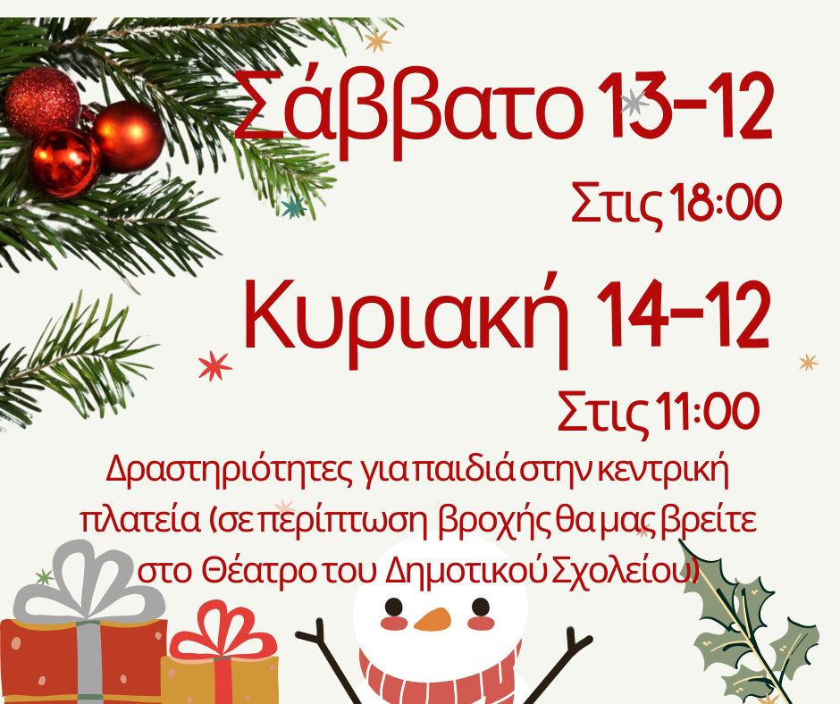 Το Σάββατο στις 18:00 και την Κυριακή στις 11:00 το πρωί, συνεχίζονται οι καθιερωμένες δραστηριότητες στα σπιτάκια της πλατείας, με δημιουργικό παιχνίδι, χαμόγελα και άρωμα Χριστουγέννων.