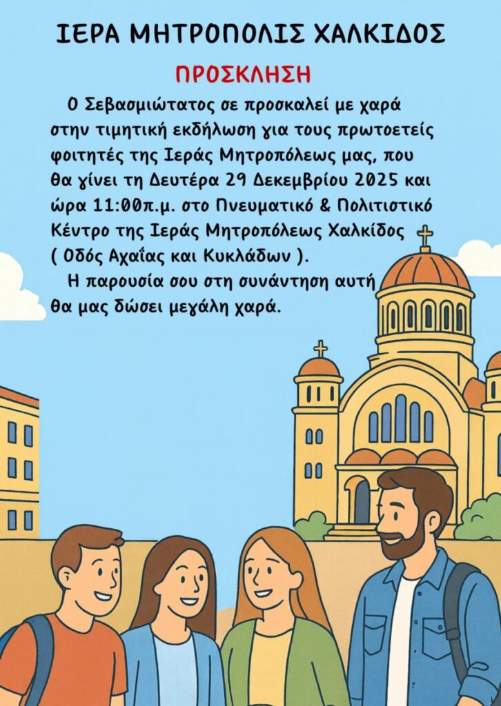 Τιμητική εκδήλωση αφιερωμένη στους πρωτοετείς φοιτητές της Ιεράς Μητροπόλεως Χαλκίδος διοργανώνει ο Σεβασμιώτατος Μητροπολίτης Χαλκίδος, Ιστιαίας και Βορείων Σποράδων κ. Χρυσόστομος, καλώντας τους νέους και τις νέες που ξεκινούν το ακαδημαϊκό τους ταξίδι σε μια ξεχωριστή συνάντηση.