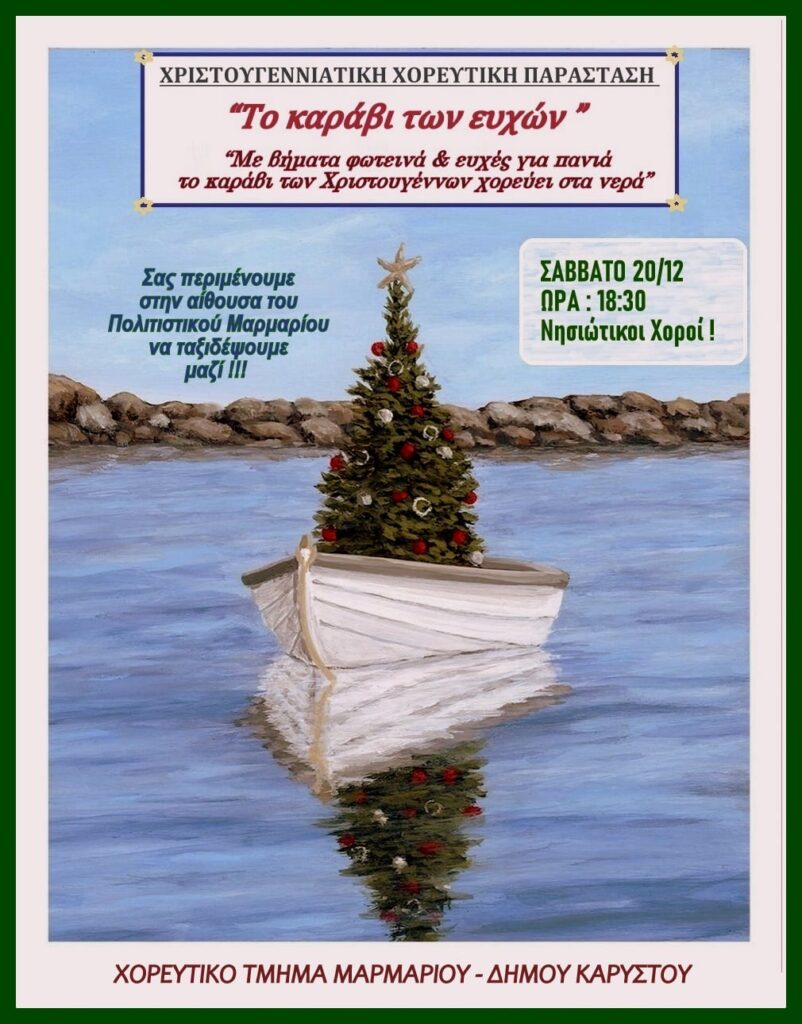 Σε έναν χώρο όπου η παράδοση συναντά το γιορτινό πνεύμα των Χριστουγέννων, το Χορευτικό Τμήμα Μαρμαρίου του Δήμου Καρύστου παρουσιάζει το Σάββατο 20 Δεκεμβρίου την ξεχωριστή χριστουγεννιάτικη παράσταση «Το καράβι των ευχών». Η εκδήλωση θα πραγματοποιηθεί στις 18:30, στην Αίθουσα Πολιτιστικού Μαρμαρίου, προσφέροντας στο κοινό ένα ταξίδι γεμάτο χορό, μουσική και νησιώτικη αύρα.