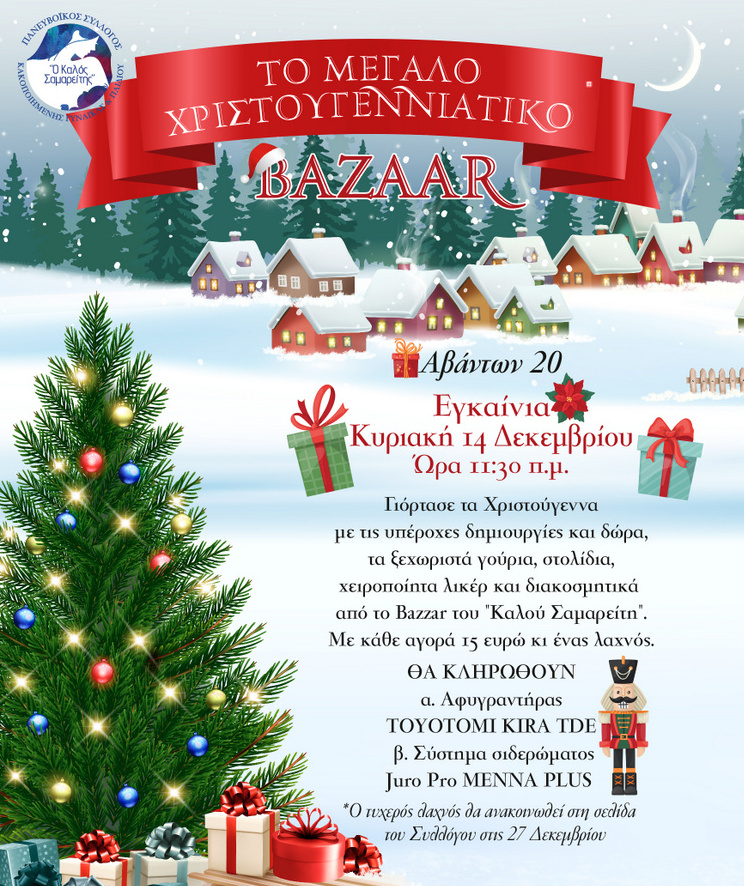 Το Μεγάλο Χριστουγεννιάτικο Bazaar του Πανευβοϊκού Συλλόγου Κακοποιημένης Γυναίκας «Ο Καλός Σαμαρείτης» ανοίγει επίσημα τις πόρτες του την Κυριακή 14 Δεκεμβρίου 2025, στις 11:30 το πρωί, στη Χαλκίδα, στην οδό Αβάντων 20.