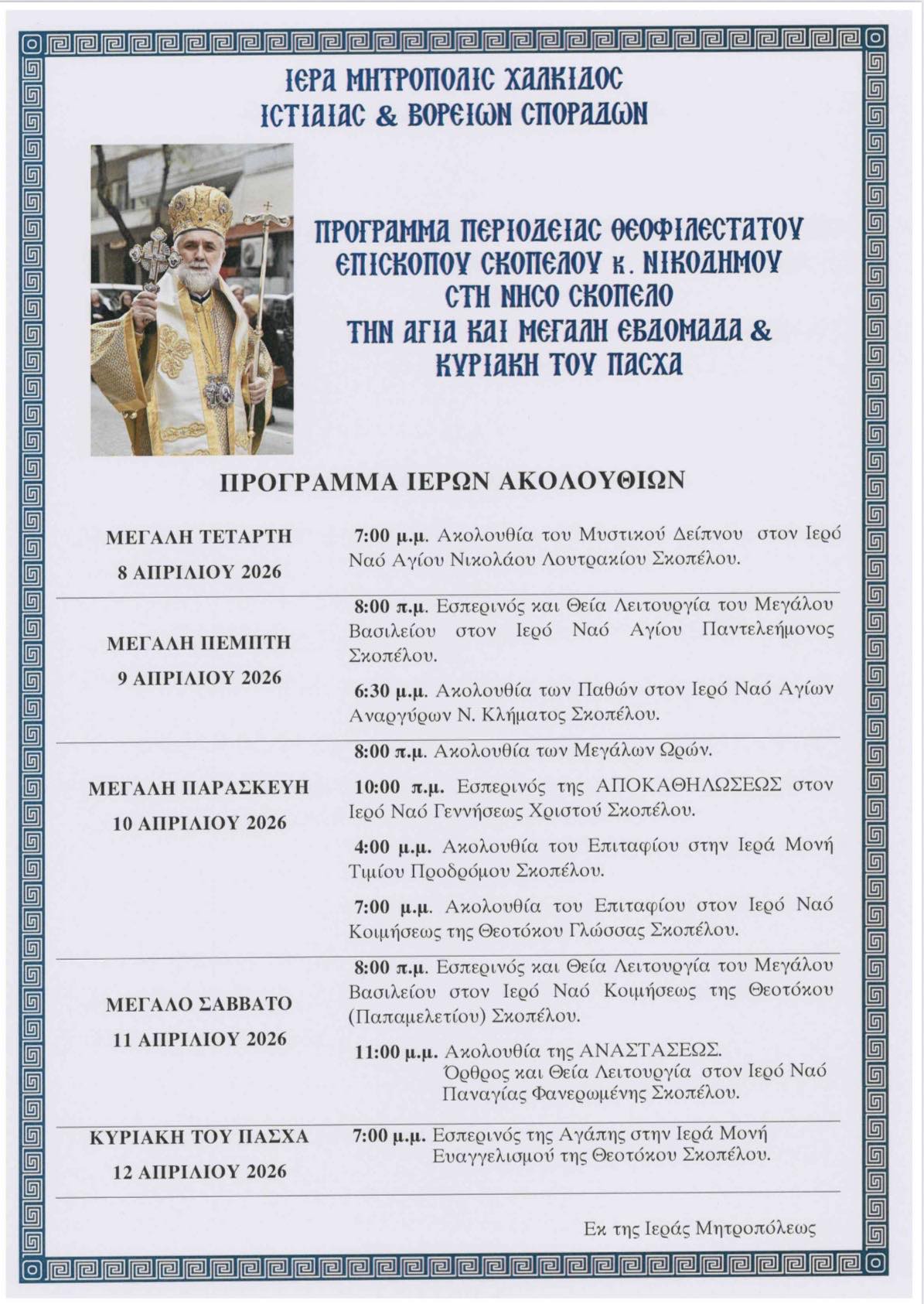Ανακοινώθηκε το πρόγραμμα των Ιερών Ακολουθιών που θα τελέσει ο Επίσκοπος Σκοπέλου Νικόδημος στη Σκόπελο, κατά τη διάρκεια της Αγίας και Μεγάλης Εβδομάδας έως και την Κυριακή του Πάσχα.