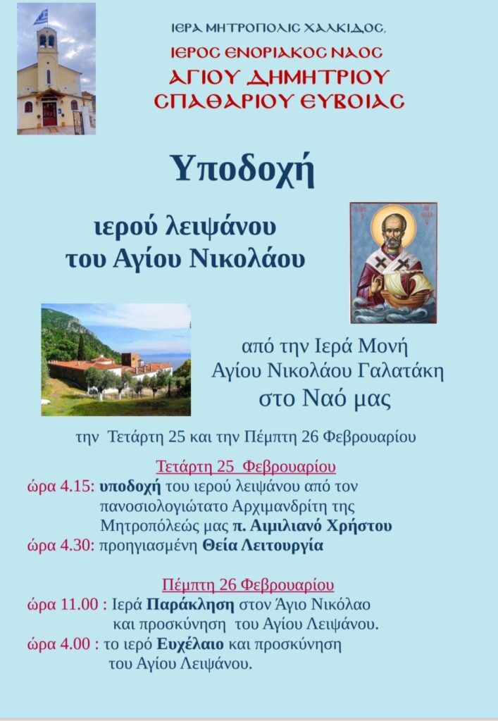 Ιερή ευλογία για την τοπική κοινωνία του Σπαθαρίου Ευβοίας αποτελεί η υποδοχή του Ιερού Λειψάνου του Αγίου Νικολάου στον Ιερό Ενοριακό Ναό Αγίου Δημητρίου, στο πλαίσιο των θρησκευτικών εκδηλώσεων που διοργανώνονται από την Ιερά Μητρόπολη Χαλκίδος.