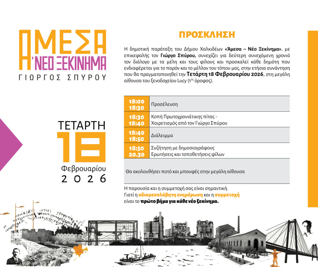 Η δημοτική παράταξη «Άμεσα – Νέο Ξεκίνημα», με επικεφαλής τον Γιώργο Σπύρου, απευθύνει ανοιχτό κάλεσμα σε πολίτες, μέλη και φίλους για την ετήσια συνάντησή της, συνεχίζοντας για δεύτερη συνεχόμενη χρονιά τον δημόσιο διάλογο γύρω από τα ζητήματα που αφορούν το παρόν και το μέλλον του Δήμου Χαλκιδέων.