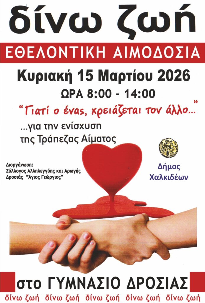 Μήνυμα προσφοράς και αλληλεγγύης στέλνει η Δροσιά την Κυριακή 15 Μαρτίου 2026, με τη διοργάνωση εθελοντικής αιμοδοσίας στο Γυμνάσιο Δροσιάς, από τις 08:00 έως τις 14:00. Η δράση έχει στόχο την ενίσχυση της Τράπεζας Αίματος του Συλλόγου Αλληλεγγύης και Αρωγής Δροσιάς «Άγιος Γεώργιος», καλώντας τους πολίτες να στηρίξουν έμπρακτα τους συνανθρώπους που έχουν ανάγκη.