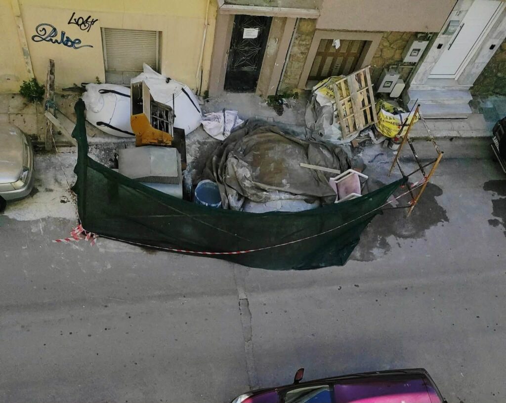 Σύμφωνα με την καταγγελία, εργασίες που φαίνεται να σχετίζονται με ανακαίνιση έχουν οδηγήσει σε πλήρη κατάληψη δρόμου και πεζοδρομίου, δημιουργώντας σοβαρά προβλήματα στην καθημερινότητα των κατοίκων και την ασφαλή διέλευση πεζών και οχημάτων.