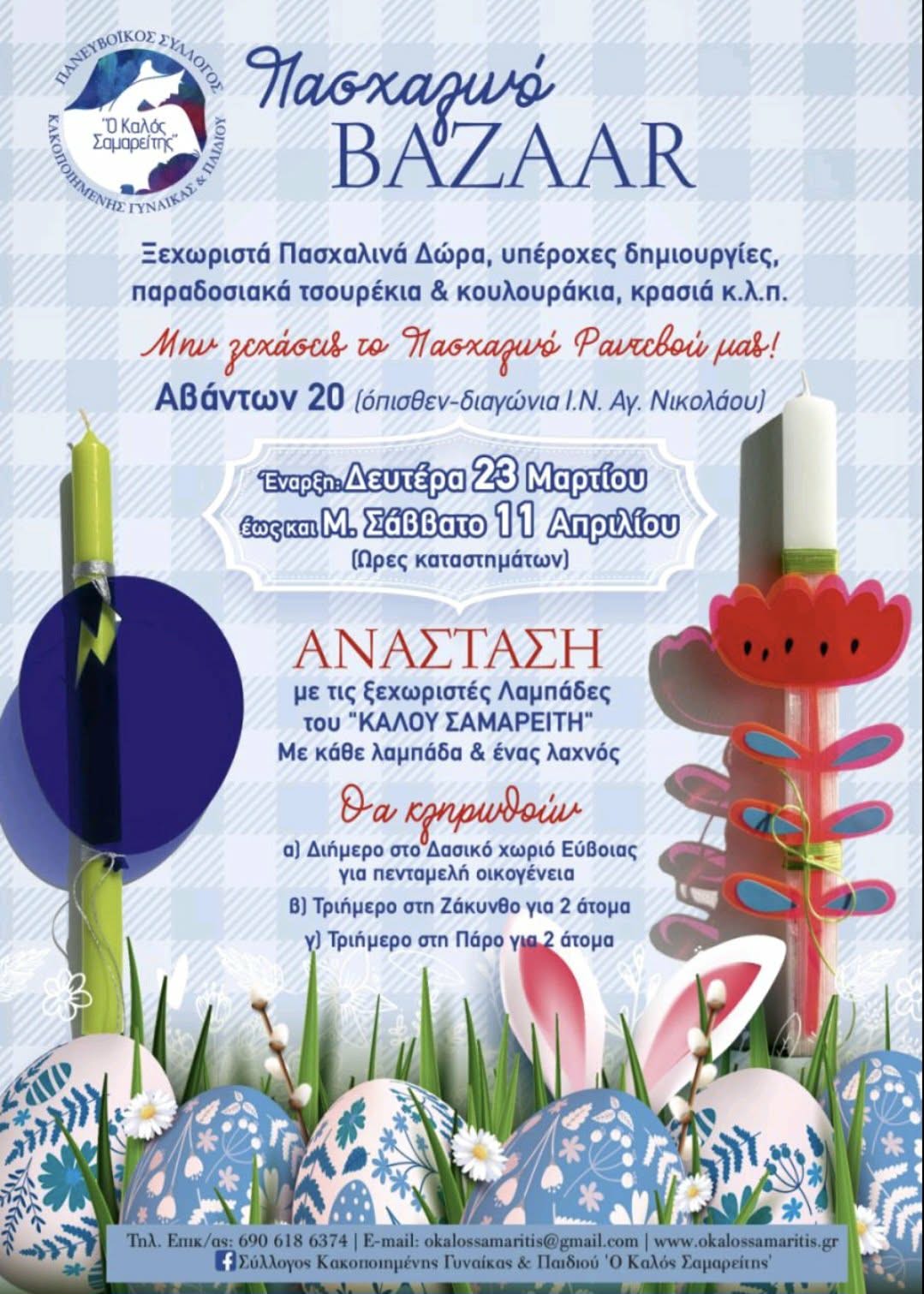 Πασχαλινό bazaar με πλούσιες επιλογές και δημιουργίες διοργανώνει ο σύλλογος «Ο Καλός Σαμαρείτης» στη Χαλκίδα, ενόψει των εορτών.