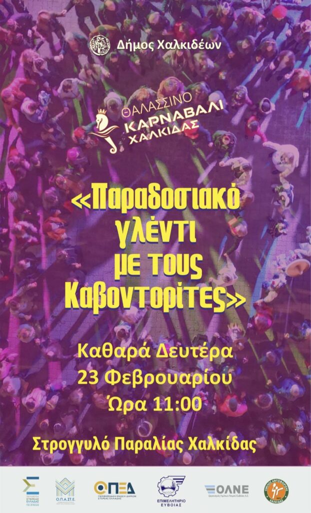 Σε ρυθμούς παράδοσης και αυθεντικού ελληνικού κεφιού θα κινηθεί η παραλία της Χαλκίδας την Καθαρά Δευτέρα 23 Φεβρουαρίου, με το παραδοσιακό γλέντι που διοργανώνει ο Δήμος Χαλκιδέων στο Στρογγυλό Παραλίας, στο πλαίσιο του Θαλασσινού Καρναβαλιού Χαλκίδας.