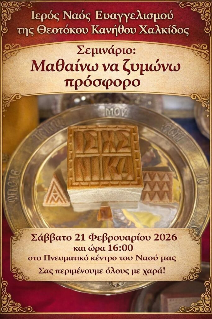Το σεμινάριο με τίτλο «Μαθαίνω να ζυμώνω πρόσφορο» θα πραγματοποιηθεί το Σάββατο 21 Φεβρουαρίου 2026 και ώρα 16:00, στο Πνευματικό Κέντρο του Ιερού Ναού. Οι συμμετέχοντες θα έχουν την ευκαιρία να ενημερωθούν αναλυτικά για τη σημασία του προσφόρου στη λατρευτική ζωή της Εκκλησίας, αλλά και να μάθουν πρακτικά βήμα-βήμα τη σωστή παρασκευή του.