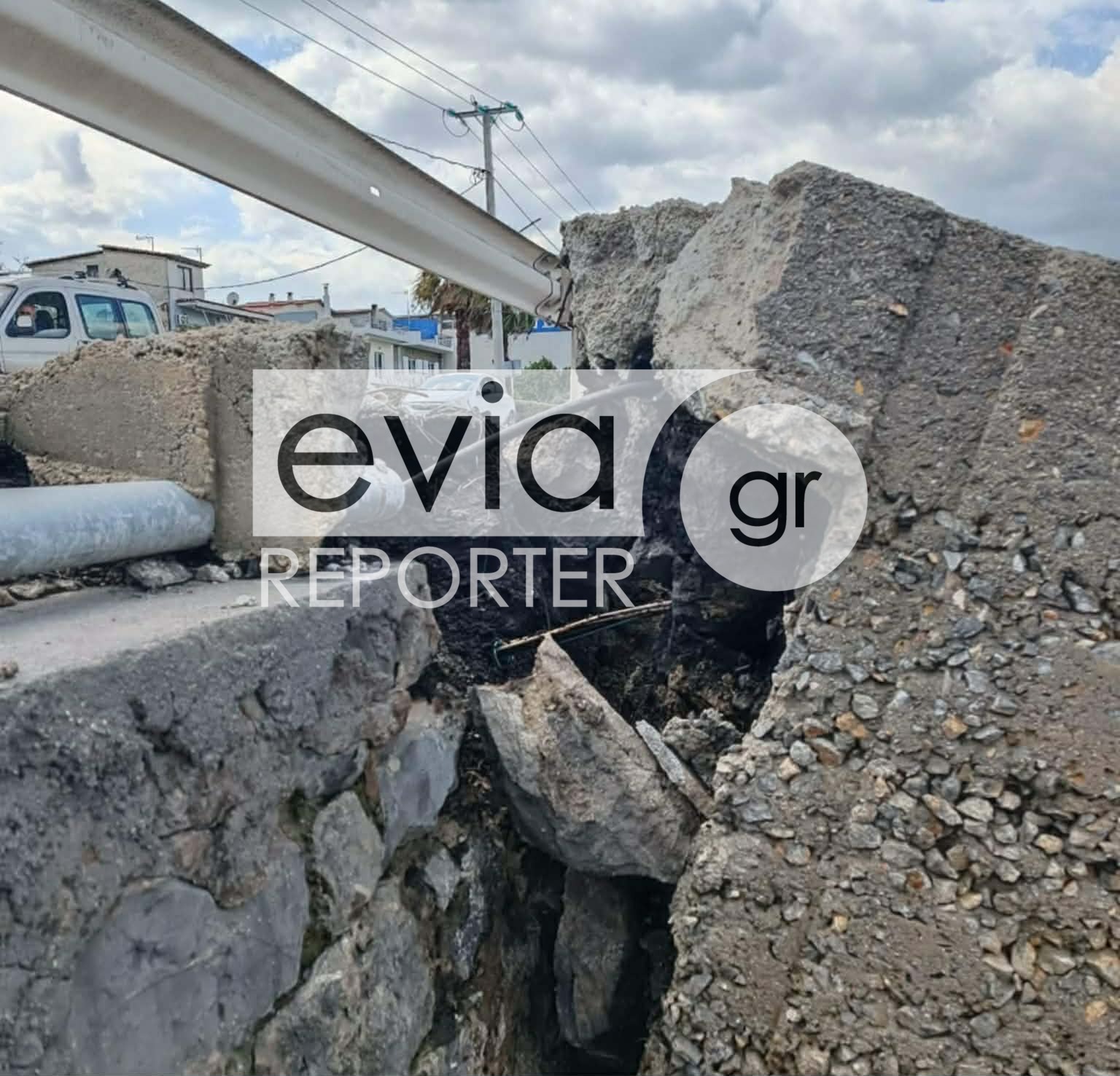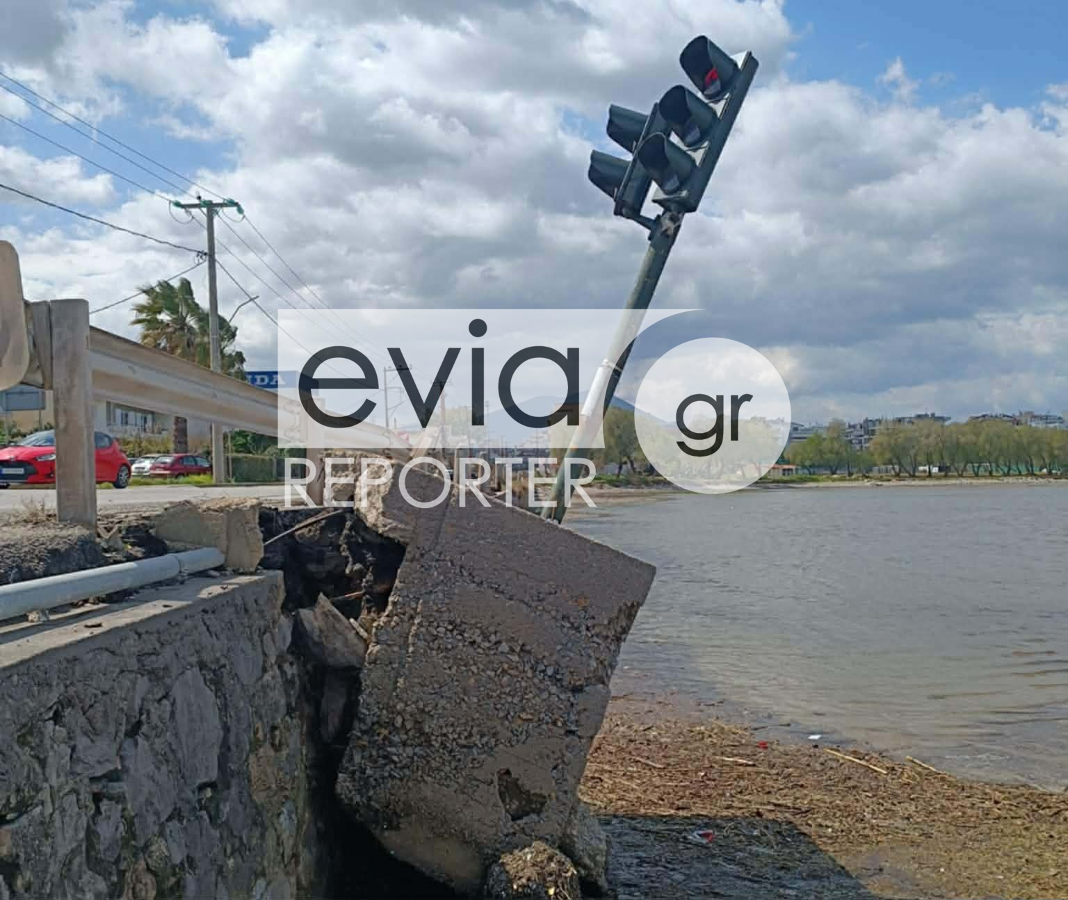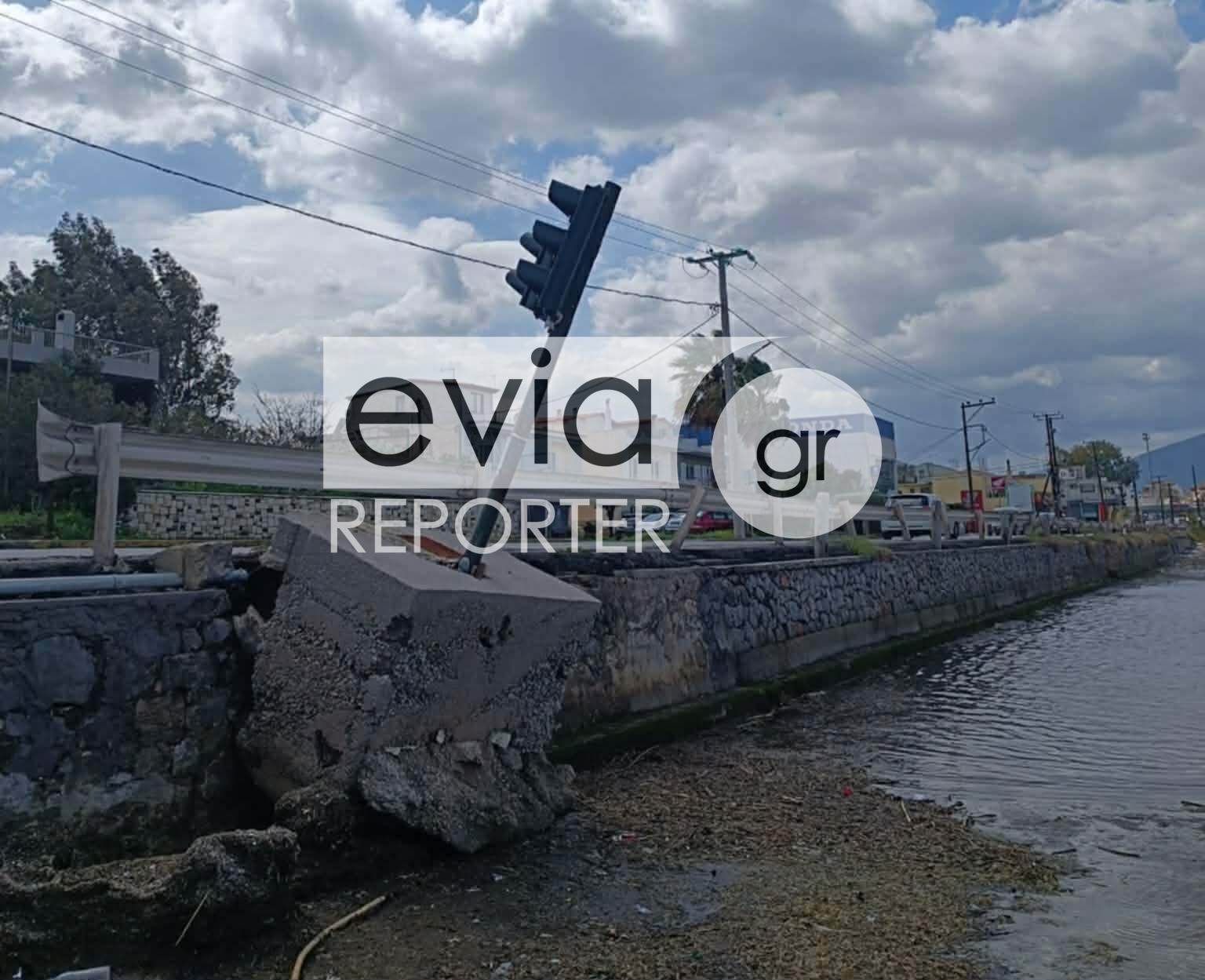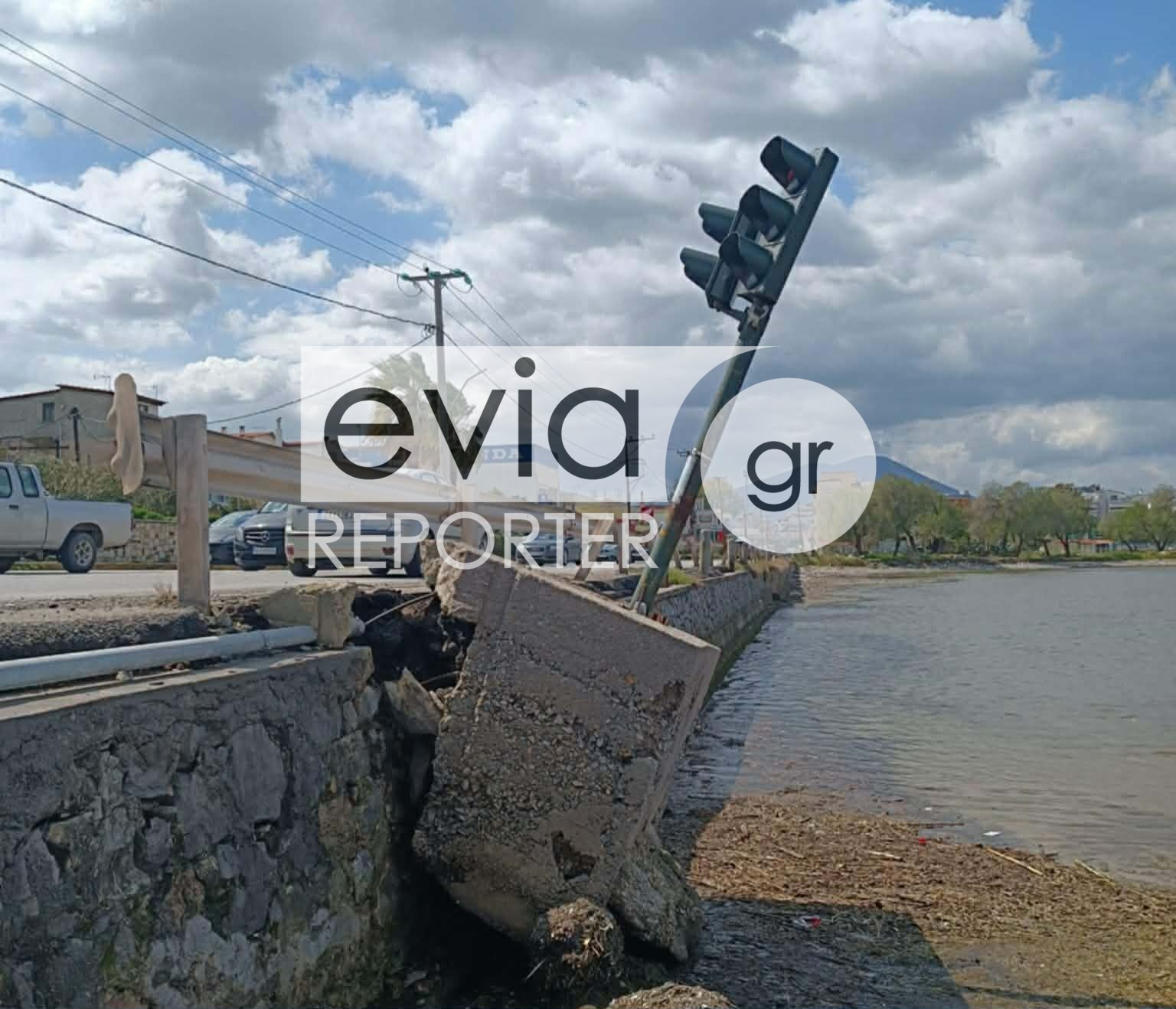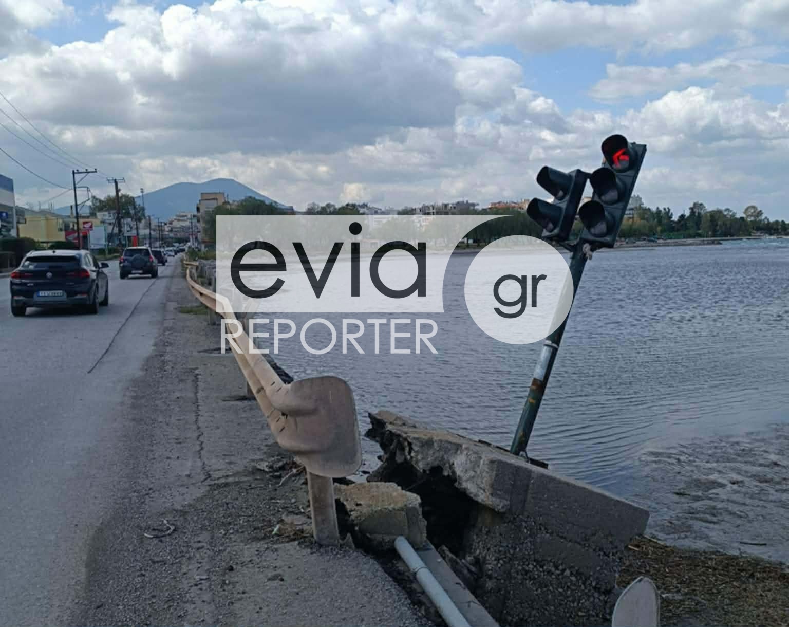 Όπως καταγράφουν αποκλειστικές πληροφορίες του eviareporter.gr, το έδαφος υποχώρησε σε σημείο όπου είναι τοποθετημένος φωτεινός σηματοδότης, με αποτέλεσμα το φανάρι να βρίσκεται κυριολεκτικά στον «αέρα».