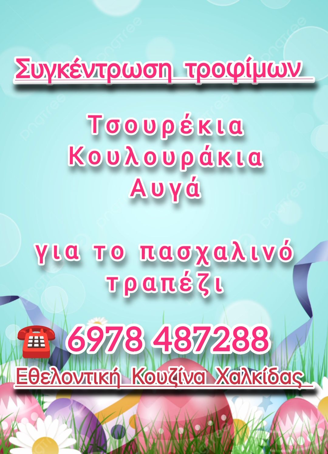 Η Εθελοντική Κουζίνα Χαλκίδας διοργανώνει συγκέντρωση τροφίμων για το πασχαλινό τραπέζι, καλώντας τους πολίτες να συμβάλουν με βασικά είδη όπως τσουρέκια, κουλουράκια και αυγά.