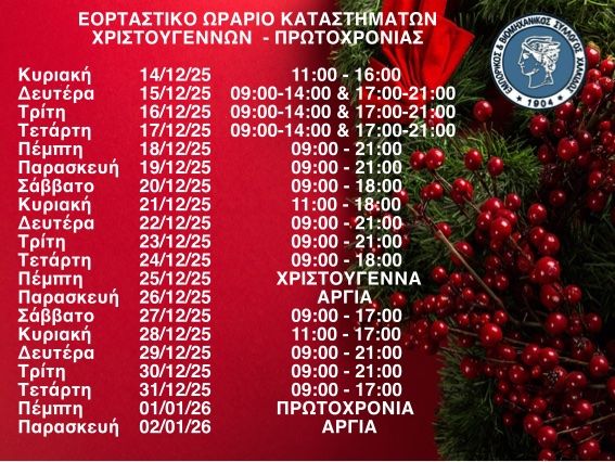 Την Πέμπτη 25 Δεκεμβρίου (Χριστούγεννα) και την Πέμπτη 1 Ιανουαρίου (Πρωτοχρονιά) τα καταστήματα θα παραμείνουν κλειστά λόγω αργίας. Το ωράριο επανέρχεται σε εορταστική λειτουργία μέχρι και το Σάββατο 3 Ιανουαρίου, ενώ την Παρασκευή 2 Ιανουαρίου τα καταστήματα θα είναι επίσης κλειστά.