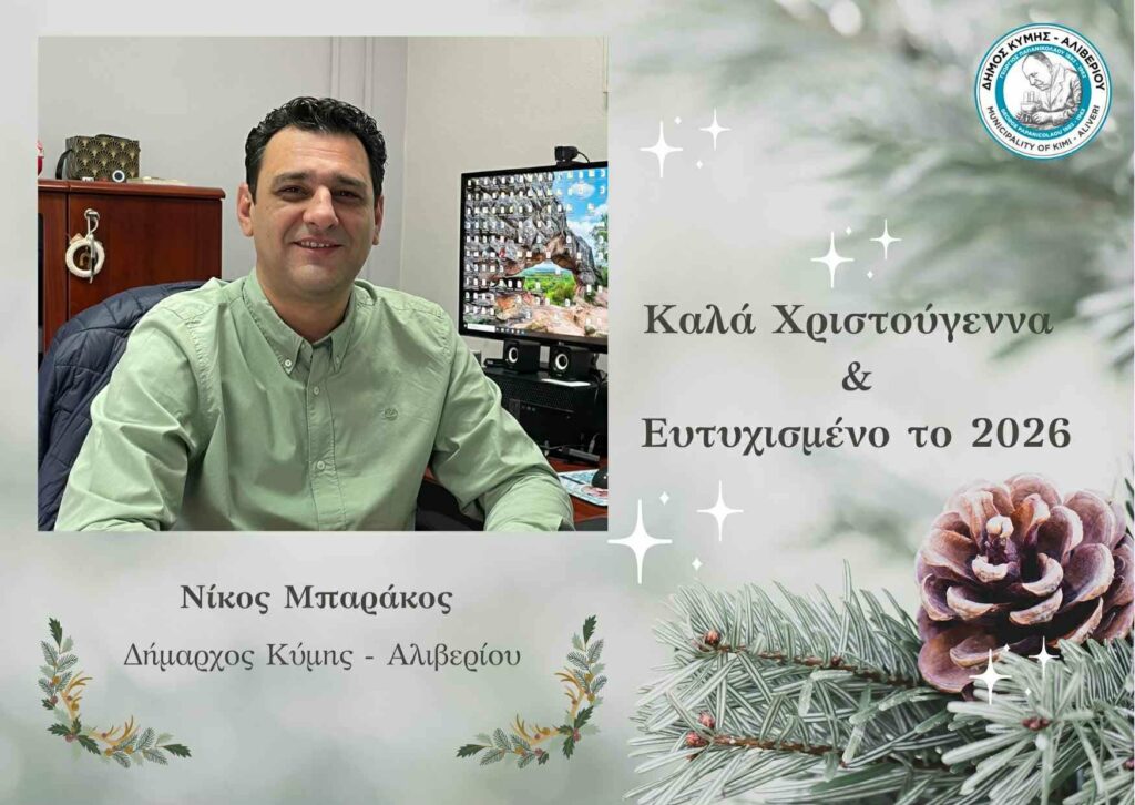 Τις ευχές του για καλά Χριστούγεννα και ένα ευτυχισμένο νέο έτος απευθύνει στους δημότες ο Δήμαρχος Κύμης–Αλιβερίου, Νίκος Μπαράκος.