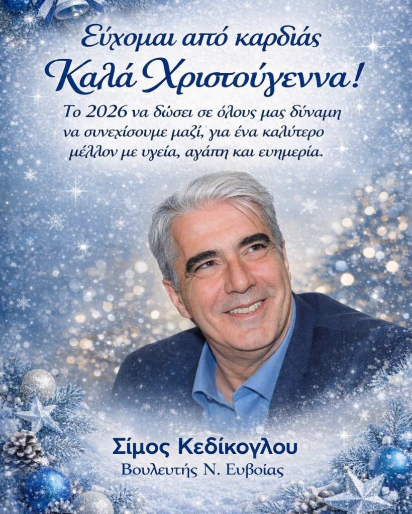 Τις χριστουγεννιάτικες ευχές του προς τους πολίτες στέλνει ο βουλευτής Εύβοιας της Νέας Δημοκρατίας, Σίμος Κεδίκογλου, με μήνυμα ελπίδας, ενότητας και αισιοδοξίας για τη νέα χρονιά.