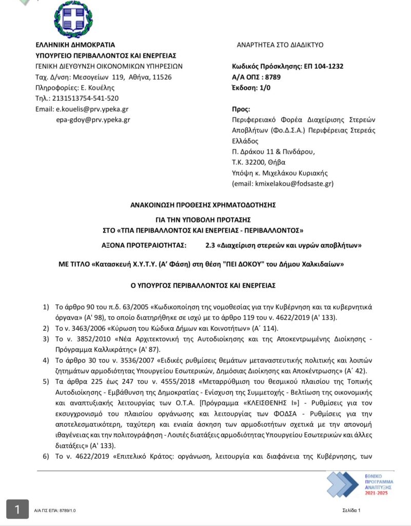 Όπως γνωστοποίησε σε ανάρτησή της, η πρόσκληση χρηματοδότησης έφτασε σήμερα, ανοίγοντας τον δρόμο για την προώθηση ενός κομβικού έργου που αφορά τη συνολική διαχείριση των απορριμμάτων των Δήμων της Κεντρικής και Νότιας Εύβοιας.