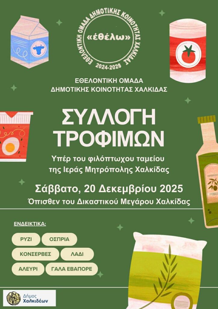 Δράση συλλογής τροφίμων υπέρ του Φιλόπτωχου Ταμείου της Ιεράς Μητροπόλεως Χαλκίδος διοργανώνει η Εθελοντική Ομάδα της Δημοτικής Κοινότητας Χαλκιδέων «εθέλω», στο πλαίσιο της κοινωνικής της προσφοράς ενόψει των εορτών των Χριστουγέννων.