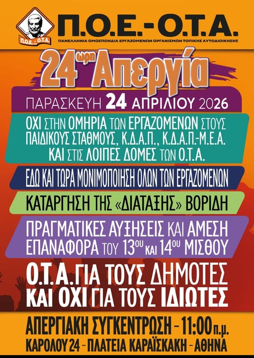 Σε 24ωρη πανελλαδική απεργία προχωρούν οι εργαζόμενοι του Δήμου Χαλκιδέων την Παρασκευή 24 Απριλίου 2026, έπειτα από κάλεσμα του Σωματείου Εργαζομένων, στο πλαίσιο των αποφάσεων της ΠΟΕ-ΟΤΑ και της ΠΟΠ-ΟΤΑ.